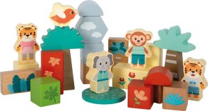 Veľa zábavy so stavaním i poznávaním sveta zvierat! Táto farebná 50-dielna drevená stavebnica vyrobená zo 100% certifikovaného FSC® dreva prináša do detskej izby veselý svet džungle plný zvieracích dobrodružstiev. Súprava poteší rôzne tvarovanými a potlačenými stavebnými kockami, doplnenými o roztomilé figúrky zvierat, ako sú tigre, pandy, opičky a vtáčiky. Vďaka širokej škále tvarov, farieb a motívov môžu deti stavať zvieracie krajiny, vysoké veže alebo kreatívne scény – fantázii sa medze nekladú! Hra s kockami rozvíja jemnú motoriku, koordináciu a priestorové myslenie, zatiaľ čo zvieracie figúrky a potlačené prvky s listami, rastlinami a prírodnými motívmi inšpirujú deti k rozprávaniu vlastných príbehov. Táto stavebnica je nielen krásnou hračkou, ale aj vzdelávacím nástrojom, ktorý podporuje kreativitu, predstavivosť a sústredenie. Vďaka veľkému podielu prírodného dreva, kvalitným ilustráciám a jemnému farebnému ladeniu pôsobí prirodzene a esteticky – skvele zapadne do každej detskej izby. Hlavné vlastnosti: kompletná sada z FSC® 100% certifikovaného dreva50 rôznych dielikov vrátane zvieratiek a rastlinných motívovdva roztomilí vtáčiky ako doplňujúce figúrky kombinácia farebných a prírodných kociek podporuje motoriku, kreativitu a predstavivosť skvele ladí s ďalšími hračkami z radu Stewardship Council) zaručuje, že drevo, z ktorého bol produkt vyrobený, nebolo vyťažené nelegálne a pochádza z lesov obhospodarovaných šetrným či prírode blízkym spôsobom, v ktorom sú dodržiavané prísne environmentálne a sociálne požiadavky. Značka FSC® na výrobku znamená, že svojim nákupom pomáhate chrániť lesy a podporujete šetrné, zodpovedné či prírode blízke hospodárenie, vďaka ktorému sú naše lesy stabilnejšie, zdravšie, majú prirodzenú druhovú skladbu a lepšie odolávajú negatívnym následkom klimatických zmien.
