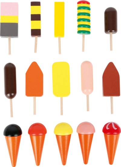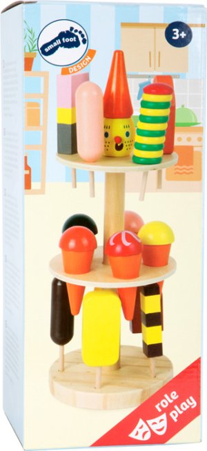 Deti poďte do cukrárne. Tento trojposchodový stojan má všetko na čo máte chuť. Zmrzlina na špajli alebo v kornútku (8-10 cm) sa dá aranžovať do pripravených otvorov. Tento zmrzlinový stojan ponúka celkom 15 rôznych a farebne zdobených zmrzlinových príchutí. Je vyrobený z farebne lazúrovaného masívneho dreva a preglejky. Jednoducho “cool” doplnok pre detské kuchyne alebo obchodu s potravinami. Hlavné vlastnosti: vyrobené z dreva obsahuje 15 dielov, podporuje hranie rolí v kuchynkách a obchodoch.