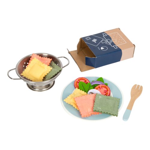 Vždy al dente! Staňte sa majstrami vo varení cestovín s bohatou súpravou riadu a rozmanitého príslušenstva. V sade nájdete atraktívne plstené makety niekoľkých druhov cestovín a ďalších prísad. Na krabičkách k ingredienciám je vyobrazený správny postup varenia, deti tak ľahko znalosťami prípravy oslnia návštevu. Riad je realisticky vyrobený z kovu a skvele doplní každú detskú kuchynku. Nevyhnutnou súčasťou je aj servis, pomocou ktorého môžu deti rozvíjať sociálne zručnosti. Hlavné vlastnosti: hrniec s vekom, cedník, 2 taniere, 2 vidličky, 3 balenia cestovín a 12 makiet prísadrealistické a odolné prevedenie