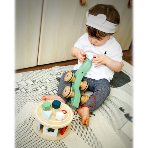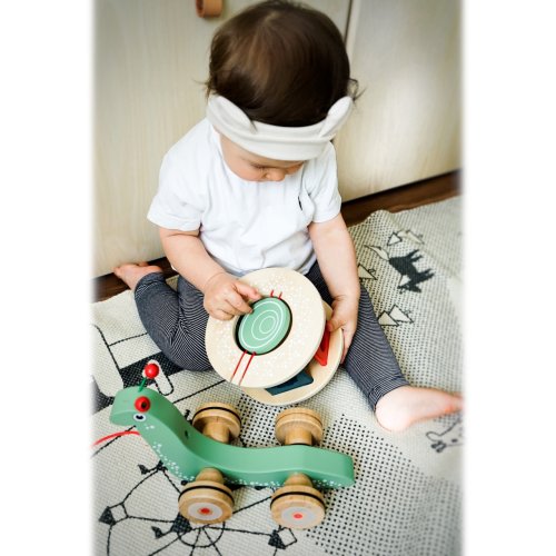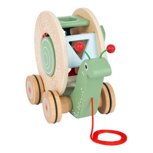 Táto drevená ťahacia hračka s priateľskými očami, mnohými detailmi a pogumovanými kolieskami inšpiruje deti k prvým krôčikom. Pri ťahaní sa šnekova ulita otáča a dieliky vo vnútri vydávajú zvuk. Dieliky môžete pomocou ich povrázkov tiež pripevniť na stranu ulity. Hračka je mixom prírodného a farbeného dreva v moderných farbách. Slimáková ulita je oddeliteľná a funguje ako vkladačka. Na strane ulity sú oddeliteľné dvierka, ktorými môžete dieliky z vkladačky opäť vybrať. Môžete ich tiež skladovať pripevnené na ulite, aby nevydávali zvuk. Múdra motorická hračka perfektná pre deti . Hlavné vlastnosti Ťahacia motorická a edukatívna hračka v jednom Oddeliteľná ulita môže byť použitá ako vkladačka Pri hre trénuje motoriku detí rôznymi spôsobmi Pri hre stimuluje sluchový vnem detí Ulita má postranné dvierka, ktorými možno jednoducho vybrať vložené dieliky Pogumované kolieska zaisťujú