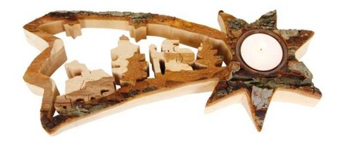 Tento stojan je vyrobený z masívneho kusu dreva a zdobený jemne vyrezaným motívom. Vyžaruje jemné svetlo.