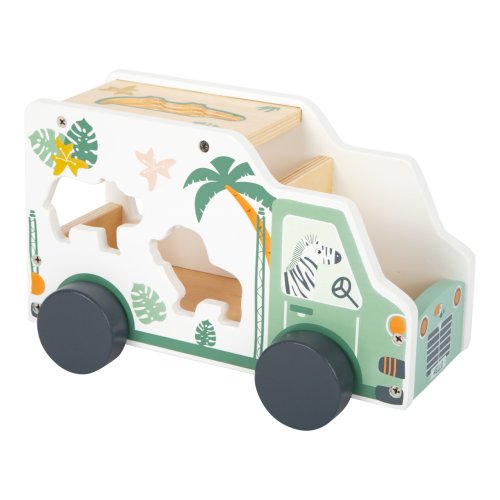 Vkladacia hračka a drevené autíčko v jednom. Drevená vkladačka v populárnom safari designe. Žirafa, hroch, lev a ich kamaráti sú pripravení na výlet do divočiny so zebrou vodičkou. Safari minibus má päť vkladacích otvorov, pre každé zviera jeden. Krásna hračka, ktorá trénuje rozpoznávanie tvarov a motoriku. Auto má mnoho detailov a dosť miesta pre roztomilé figúrky. Dlhotrvajúca zábava v každej detskej izbičke! Hlavné vlastnosti: ilustrované, pastelové farbyauto a 5 dielov