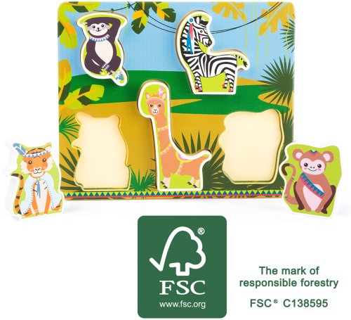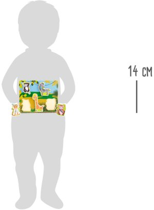 Farebná detská vkladačka s obrázkami veselých zvieratiek z džungle. Vkladačka deti učia všímavosti, rozvíja predstavivosť a pamäť. Drevená podložka uľahčuje skladanie a rámčeky zabezpečujú, aby jednotlivé drevené zvieratká držali na svojich miestach. Deti sa môžu učiť poznávať divé zvieratká. Vhodné pre deti od 12 mesiacov.