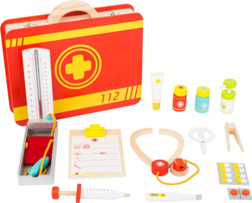Trendy lekárska súprava v kufríku pre mladých doktorov a doktorky. Všetky predstierané lekárske úkony u lekára, alebo na pohotovosti, zvládnu deti v detskej izbičke s týmto dreveným lekárskym kufríkom. Početné náčinie splní prianie každého mladého lekára. Injekčné striekačky a nádobky na masti sú dokonca vybavené funkciou pumpy. Takto si môžu všetky bábiky a medvedíky nechať zmerať krvný tlak a ošetriť drobné ranky. Všetky ošetrenia je možné nakoniec zapísať do praktickej lekárskej dokumentácie. Komplexné vybavenie vrátane tlakomeru, lekárskej dokumentácie, stetoskopu, pinzety, teplomera, striekačky, nožníc, dávkovača dezinfekčného roztoku s pumpičkou. Obsahuje tiež tubu na masť, nádobky na tablety a blistrové balenie tabliet. Hračka deťom pomôže s rozvojom sociálnych zručností a rozprávačstva. Ďalší, prosím! Hlavné vlastnosti: lekárska súprava s množstvom dreveného lekárskeho vybaveniapružné elastické pásky a oddelené priehradky udržia lieky a lekárske vybavenie na mieste klasické doktorské symboly a kresby, ktoré sú pre deti ľahko zrozumiteľnépodporuje aktívne hranie a rozvíja sociálne zručnosti
