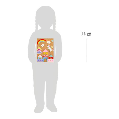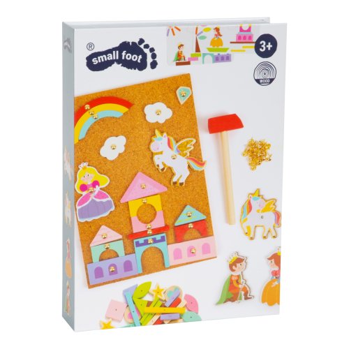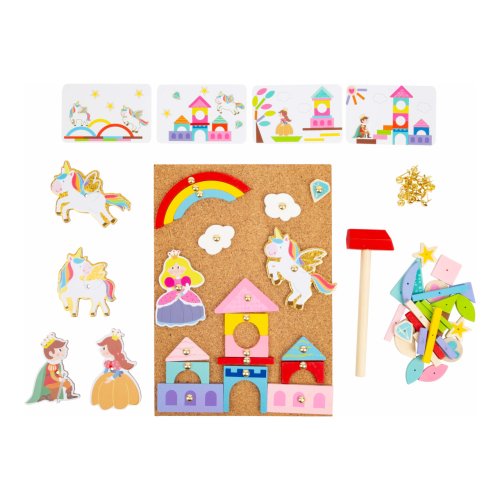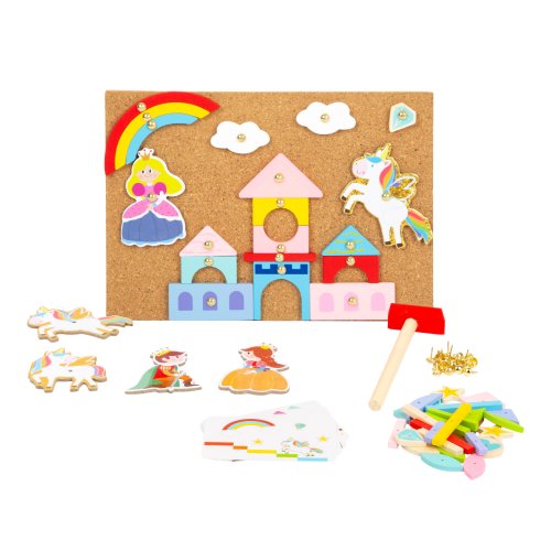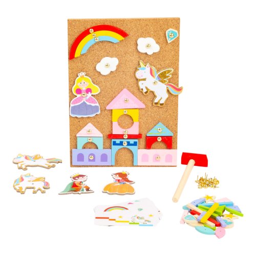 Magická zábava s kladivom a pripináčikmi. V balení nájdete korkovú dosku, kladivo, pripináčiky a drevené objekty rôznych tvarov. Deti si môžu na doske/nástenke vďaka zatĺkačke vytvoriť rôzne obrázky. Či je to princezná, rozprávkový hrad alebo jednorožec, obsazuje táto sada všetko na vytvorenie kúzelného obrazu. V balení nájdete aj obrázkové predlohy, z ktorých sa deti môžu inšpirovať. Táto hra podporuje rozvoj kreativity a dá deťom vlastný priestor na tvorenie. Všetko je zabalené v praktickom boxe a tak sa vám nič zo sady nestratí! Hlavné vlastnosti: podporuje kreativitu a koncentráciu podporuje jemnú motoriku praktický úložný box