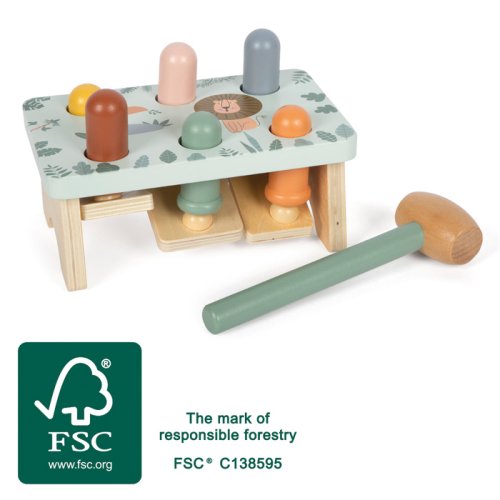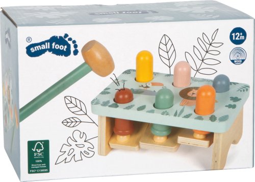 Tato nádherně zpracovaná zatloukací hra v safari stylu je vyrobena ze 100% FSC® certifikovaného dřeva a zve děti ke hraní plnému překvapení! Pomocí kladívka děti zatloukají dřevěné kolíčky do lavičky, a právě tehdy přichází ten správný efekt, když zatlučou jeden kolík, na opačné straně vyskočí druhý! Roztomilé zvířecí motivy a moderní barevné provedení podněcují dětskou fantazii a chuť objevovat. Pohyblivé kolíčky zároveň dětem ukazují princip příčiny a následku, ideální pro hravé učení. Tato hračka je dlouhotrvajícím společníkem, který spojuje radost ze hry s rozvojem důležitých dovedností a navíc skvěle vypadá! Hlavní vlastnosti: vyrobeno ze 100% FSC® certifikovaného dřevapodporuje rychlé reakce, motoriku a koordinaci ruka-okopevné a odolné zpracováníkladívko padne skvěle do dětských ručičekkrásný designstimuluje dětskou fantazii Značka a certifikát FSC® (Forest Stewardship Council) zaručuje, že dřevo, ze kterého byl produkt vyroben, nebylo vytěženo nelegálně a pochází z lesů obhospodařovaných šetrným či přírodě blízkým způsobem, ve kterém jsou dodržovány přísné environmentální a sociální požadavky. Značka FSC® na výrobku znamená, že svým nákupem pomáháte chránit lesy a podporujete šetrné, odpovědné či přírodě blízké hospodaření, díky kterému jsou naše lesy stabilnější, zdravější, mají přirozenou druhovou skladbu a lépe odolávají negativním následkům klimatických změn.