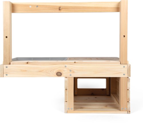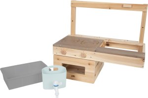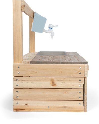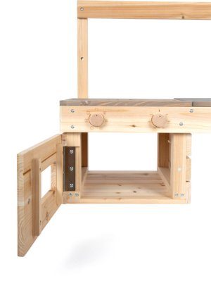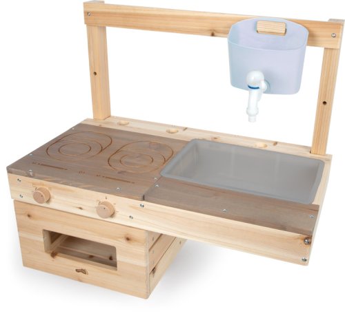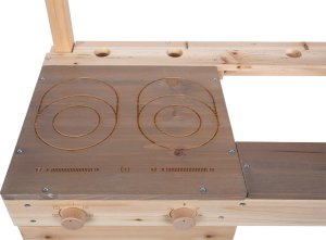 Inteligentné riešenie pre kreatívne kulinárske zážitky aj v tých najmenších priestoroch! Táto priestorovo úsporná vonkajšia kuchynka je vďaka svojej kompaktnej konštrukcii ideálnou voľbou pre menšie záhrady, terasy alebo detské ihriská. Môžete ju ľahko zavesiť na hernú zostavu, záhradný domček alebo akúkoľvek stenu a vytvoriť tak deťom štýlový herný kút. Kuchynka je vybavená varnou doskou s gravírovanými zónami a dotykovým ovládaním, praktickou rúrou s dvoma otočnými gombíkmi a nechýba ani závesný zásobník na vodu s funkčným kohútikom a drezom. Pracovná plocha je pre vyššiu odolnosť ošetrená náterom v kontrastnej farbe, ktorý podčiarkuje moderný vzhľad hračky. Vďaka praktickým výrezom v doske majú malí kuchári svoje varešky, klúčiky a ďalšie nevyhnutné náčinie neustále po ruke. Táto robustná konštrukcia umožňuje deťom naplno rozvinúť fantáziu pri varení z blata a vody bez toho, aby zaberala miesto na zemi. Lakovaný povrch pracovnej dosky poskytuje elegantný kontrast k prírodnému drevu a dodáva celku šmrnc. Aby vám kuchynka robila radosť čo najdlhšie, odporúčame neošetrené drevené časti ošetriť vhodnou impregnáciou. Upozorňujeme, že prvky na samotné upevnenie na stenu nie sú súčasťou dodávky . Hlavné vlastnosti: kompaktná kuchynka z neošetreného masívneho dreva v závesnom prevedenípracovná plocha s odolným náterom proti poveternostným vplyvomzávesná nádoba na vodu s funkčným kohútikom a vyberateľným drezomvybavená varnou doskou a rúrou vrátane gravírovaných ovládacích prvkov a otočných gombíkov zvislé plochyrobustné a variabilné prevedenie, ktoré sa prispôsobí vašim potrebámideálne riešenie pre malé záhrady, terasy alebo balkóny