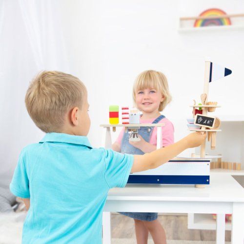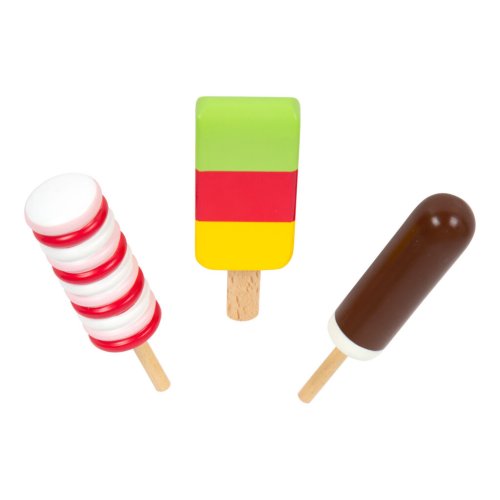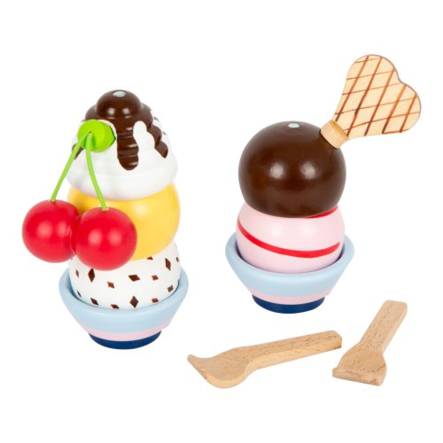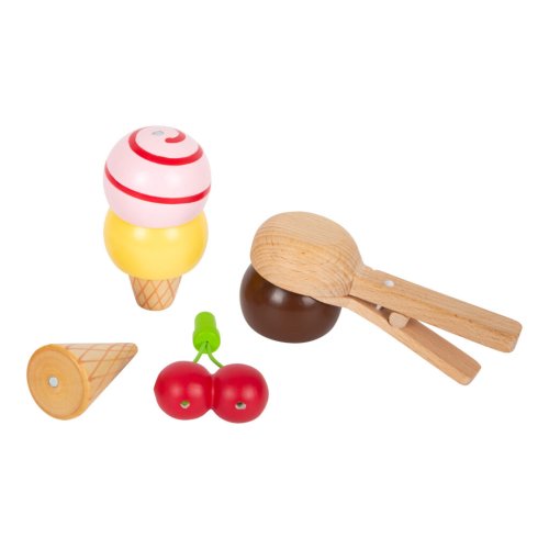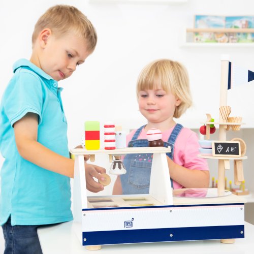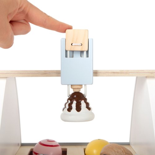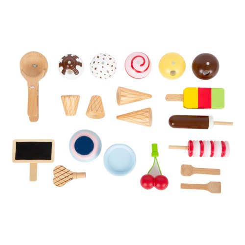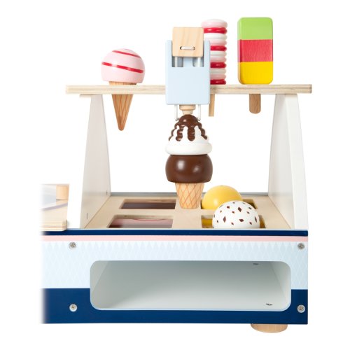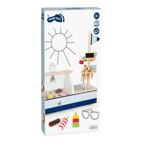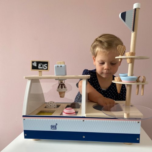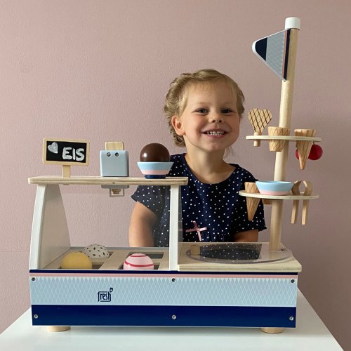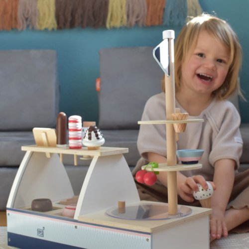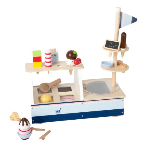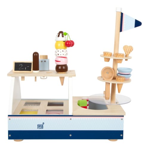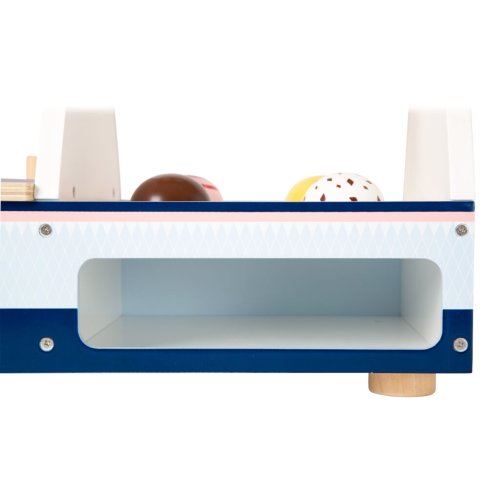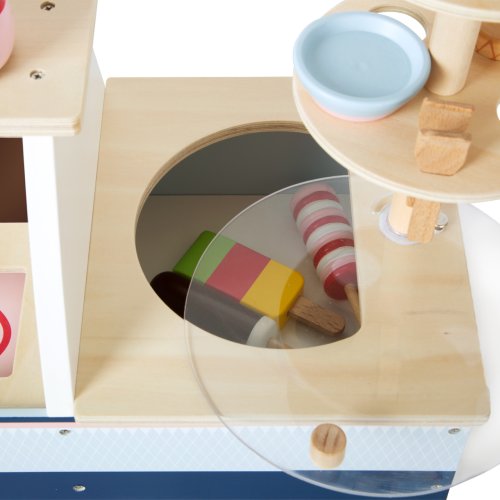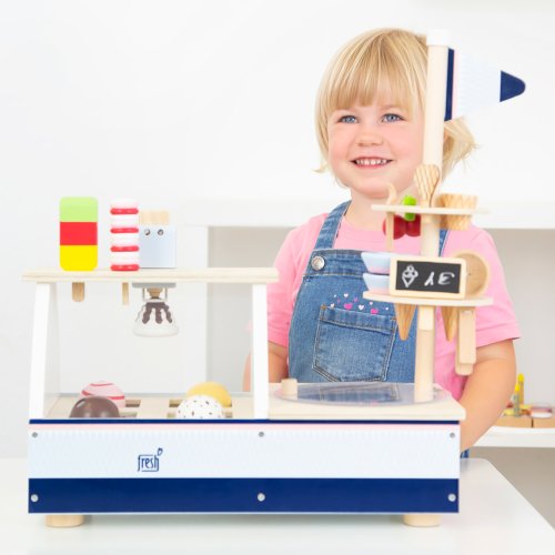 Ideme na zmrzlinu! Tento drevený zmrzlinový set je perfektný na leto aj zimu. Zmrzlinový stánok je modro-ružový, má aj prvky prírodného dreva, zákazníkov nadchne veľkým výberom dezertov a svojimi funkciami a príslušenstvom. Môžete si dať viac kopčekov zmrzliny, nanuk, točenú zmrzlinu, poháre, wafle... a to všetko ozdobiť čerešničkou. Stánok má tiež plastovú vitrínu, mrazničku s plastovým poklopom, stojan na kornúty. Kopčeky zmrzliny a točená zmrzlina sú magnetické, v balení tiež nájdete tabuľku, na ktorú môžete písať kriedou. Zmrzlinu (vanilku, čokoládu, stracciatellu a jahodu) môžete z vitríny vybrať a dať ju do misky alebo kornútku. Všetky sa tiež zmestia na wafli. Vytvorte si dezert podľa svojho gusta. Zmrzlinový stánok má aj úložný priestor. Hlavné vlastnosti Zmrlinové kopčeky a točená zmrzlina s magnetmiOsem rôznych príchutí zmrzliny, nanukyKopečky sa dajú skladať na seba vďaka magnetomVeľké a malé zmrzlinové kornúty, misky s lyžicami, wafleStánok s plastovou vitrínou, mraznička
