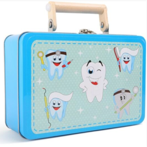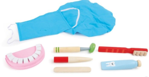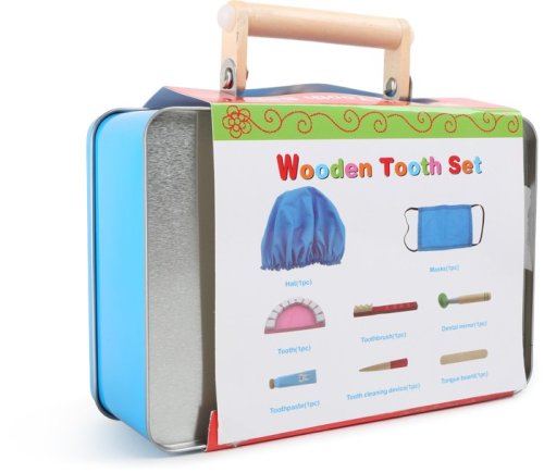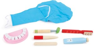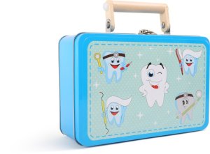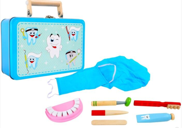 Nebojte sa zubára! S touto drevenou zubárskou sadou sa deti môžu pripraviť na ďalšiu návštevu u zubára a skontrolovať, či majú medvedíky a bábiky zuby v poriadku. S rúškom a látkovou čiapkou sa deti behom chvíľky premenia na skutočných zubárov. Vďaka kovovému kufríku je sada ideálna aj na cesty. Pokiaľ chcete svoje deti pripraviť na zubára, s touto hernou sadou to hravo zvládnete. Balenie obsahuje: rúško, čiapku, zuby, kefku, pastu, zrkadlo a ďalšie náčinie