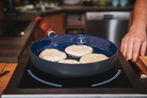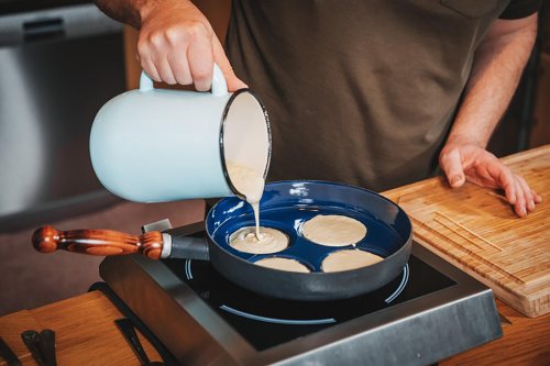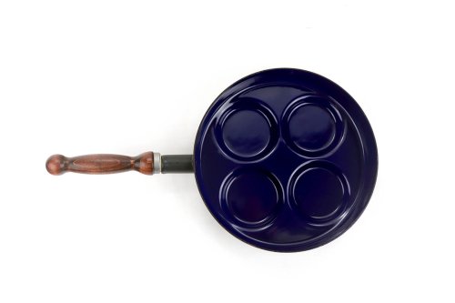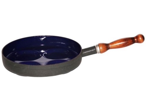 Smaltovaný lievanečník s drevenou rukoväťou Belis. Priemer 24 cm.