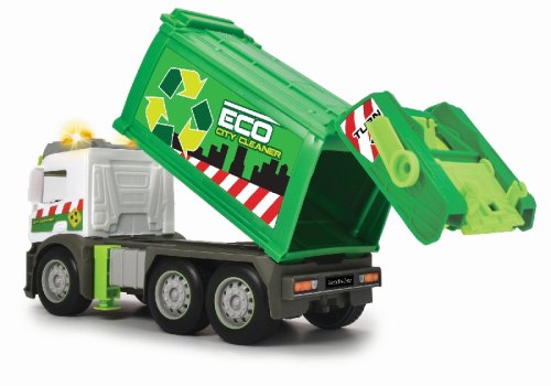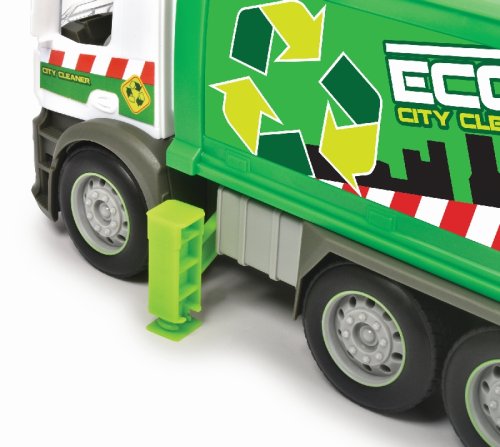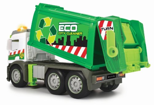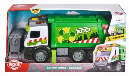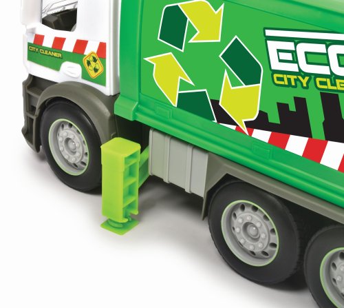 Smetiarske auto Mercedes na zotrvačník so svetelnými a zvukovými efektmi a pohyblivými dielmi, s kontajnerom. Sklápanie korby a otvárací zadný panel. Dĺžka 26 cm.