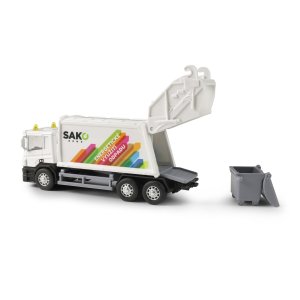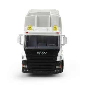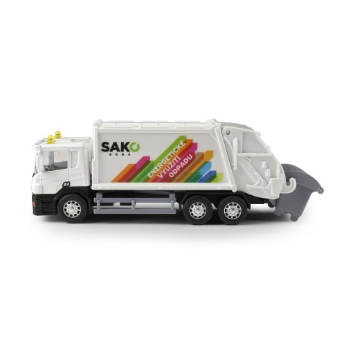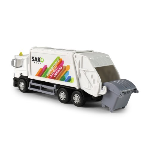 Kovové smetiarske auto s plastovou korbou a logom SAKO. Firma SAKO poskytuje komplexné služby v oblasti odpadového hospodárstva pre mesto Brno. Korba má v zadnej časti odklápacie dvere, súčasťou je otváracia popolnice. Auto jazdí na spätný chod a jeho dĺžka je 15 cm.