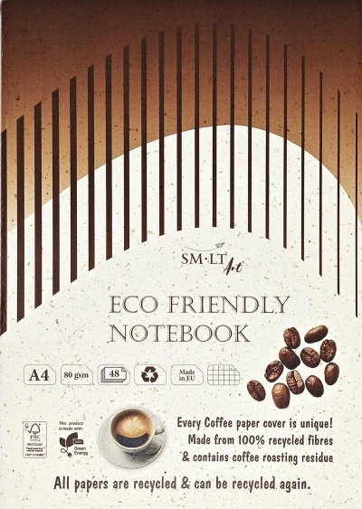 Šitý eko zápisník so štvorčekmi. Vyrobený zo 100% recyklovaného papiera a môže byť znovu recyklovaný. Vnútorný papier obsahuje zvyšky po pražení kávy. Zápisník je šitý, má 48 listov, 80g/m2.