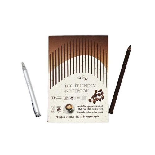 Šitý eko zápisník so štvorčekmi. Vyrobený zo 100% recyklovaného papiera a môže byť znovu recyklovaný. Vnútorný papier obsahuje zvyšky po pražení kávy. Zápisník je šitý, má 48 listov, 80g/m2.