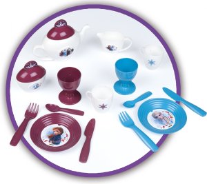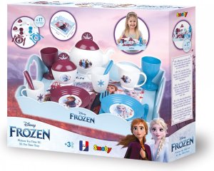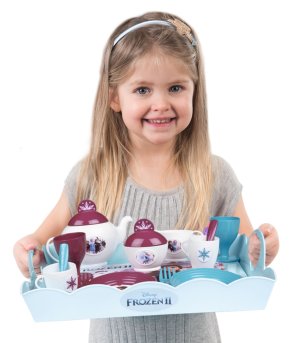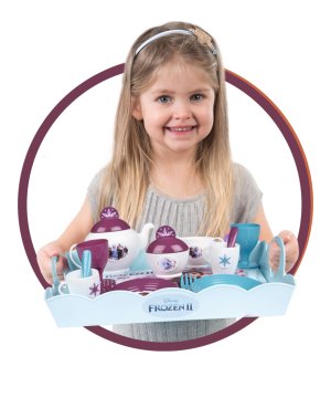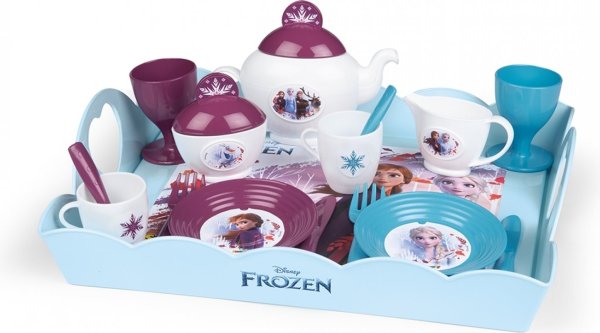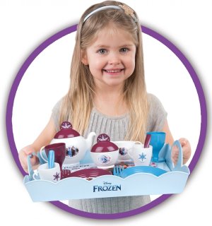 Súprava na servírovanie čaju s táckou s motívom princezien z filmu Ľadové kráľovstvo 2. Obsahuje 17 ks príslušenstva: hrnčeky, poháriky, tanieriky, príbor, kanvičku na čaj s pokrievkou, cukorničku s pokrievkou a kanvičku na mlieko. Rozmery tácky: 34 x 27 x 8,5 cm.