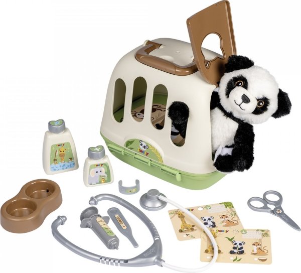 Sada obsahuje: kufrík s boxom, plyšovú pandu, misku, injekčnú striekačku, teplomer, náramok, obväz, nožnice, fľaštičky a stetoskop.
