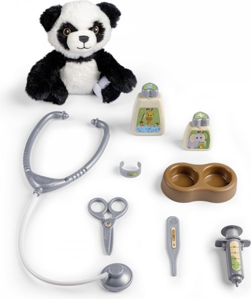 Sada obsahuje: vozík, kufrík s boxom, plyšovú pandu, misku, injekčnú striekačku, teplomer, náramok, obväz, nožnice, 2 fľaštičky a stetoskop.