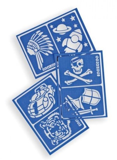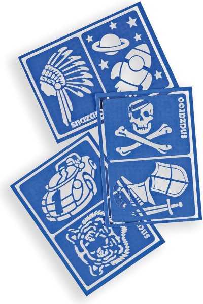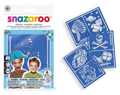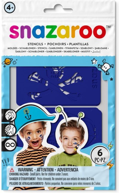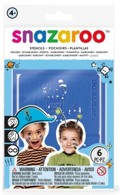 tematicky zamerané na dobrodružstvo (piráti, indiáni, vesmír...) skvelý doplnok pre maľovanie na tvár a telo samolepiaci podklad udrží šablónu na mieste pružný materiál sa ľahko prispôsobí krivkám tváre alebo rúk opakovane použiteľné a umývateľné ideálne na použitie s farbami na tvár a telo Snazaroo