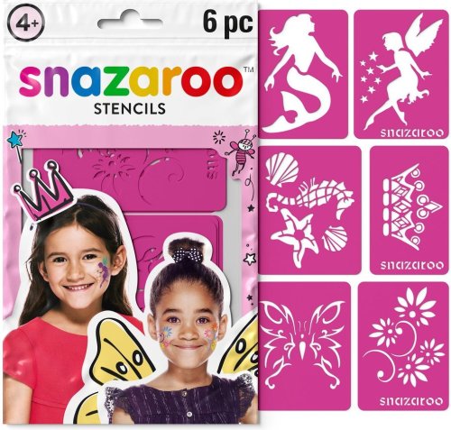 tematicky zamerané na princezné, motýle, víly skvelý doplnok pre maľovanie na tvár a telo samolepiaci podklad udrží šablónu na mieste pružný materiál sa ľahko prispôsobí krivkám tváre alebo rúk opakovane použiteľné a umývateľné ideálne pre použitie s farbami na tvár a telo Snazaroo