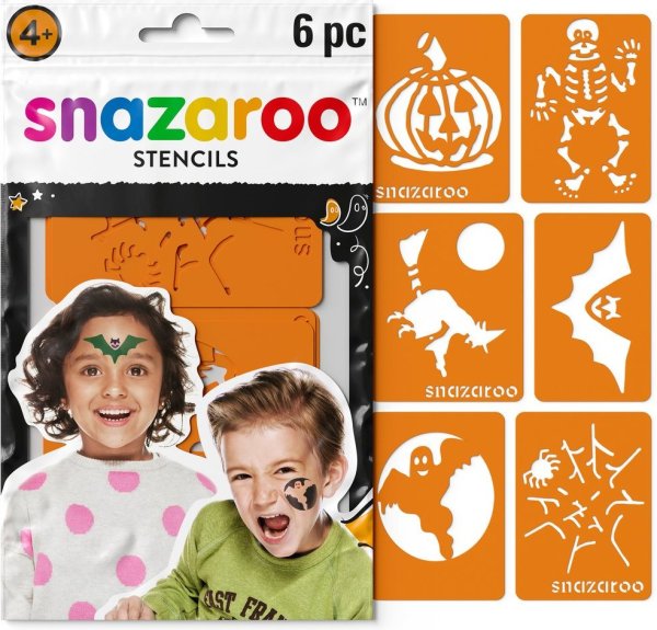 tematicky zamerané na Halloween skvelý doplnok pre maľovanie na tvár a telo samolepiaci podklad udrží šablónu na mieste pružný materiál sa ľahko prispôsobí krivkám tváre alebo rúk opakovane použiteľné a umývateľné ideálne pre použitie s farbami na tvár a telo Snazaroo