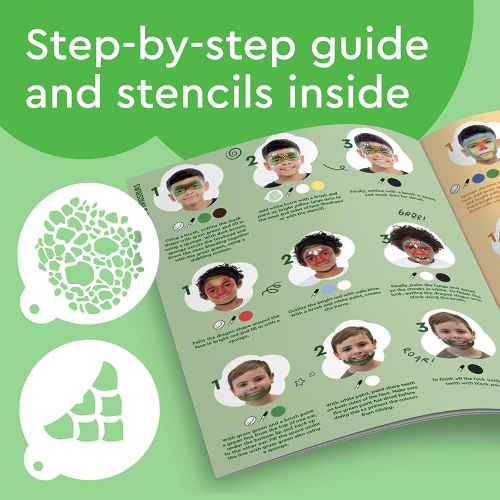ideálna na oslavy, karnevaly, halloween alebo pálenie čarodejníc jednoduchá aplikácia - štetcom alebo hubkou vhodné pre tvár i telo dlhotrvajúce, jasné a sýte farby na namaľovanie najmenej 40 plnofarebných tvárí bezpečné a netoxické, vhodné aj pre citlivú kožu ľahko odstrániteľné - umývateľ 8 farieb, hubky, štetec, šablóny a obrázkový návod