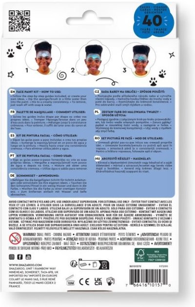 vybrané farby pre vytvorenie dokonalých masiek ideálne na detské oslavy, karnevaly, party alebo halloween jednoduchá aplikácia - štetcom alebo hubkou vhodné pre tvár i telo dlhotrvajúce, jasné a sýte farby bezpečné a netoxické, vhodné aj pre citlivú kožu ľahko odstrániteľné - umývateľné, štetec