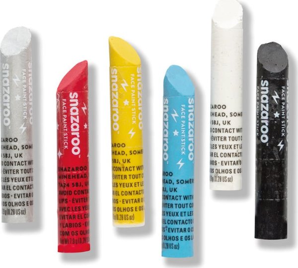 Sada 6 farebných tyčiniek v tvare ceruziek na maľovanie na tvár a telo Snazaroo .