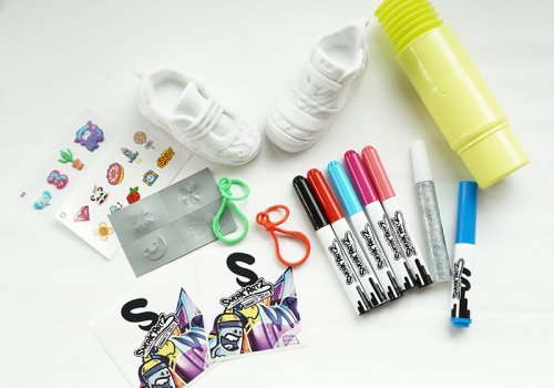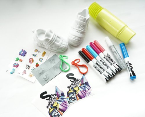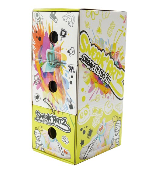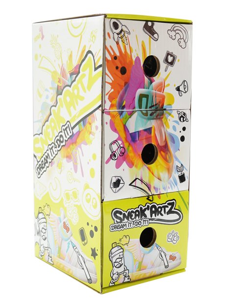 Vždy ste snívali o tom mať tenisky, ktoré nevyzerajú ako ostatní? S Sneak'artz si môžete vyrobiť vlastnú topánku! Navrhnite a vytvorte svoj dizajn so všetkými priloženými doplnkami. Balenie obsahuje: 2 tenisky, 1 trblietky, 6 dekoračných fixiek (možno použiť aj ako fúkacie), plastické samolepky, samolepky, 2 prívesky a zoznam tenisiek, kde si označíš, akú tenisku máš. Nazbieraj všetkých 24 druhov. Svoju tenisku si môžeš zavesiť napríklad na batoh alebo kľúče.