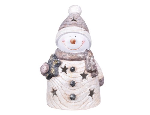 Dekorácia v podobe snehuliaka v kabátiku so šálom a hviezdou. Vhodná na obdobie Vianoc a zimy. Funguje ako svietnik na čajovú sviečku. Pomôže navodiť atmosféru všetkým milovníkom svietiacich dekorácií. Vhodná do interiéru a exteriéru. Materiál: MGO keramika. Rozmery: dĺžka 26 cm, hĺbka 22 cm, výška 40 cm. Farba: šedá.
