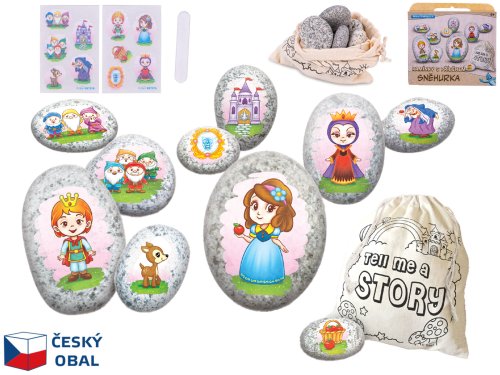 V krabičke nájdete 10 starostlivo vybraných prírodných kamienkov so samolepkou s postavičkami a prvkami z rozprávky Snehulienka.