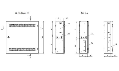 19" rámy majú rozmery 4U a 11U vo vertikálnom smere a 2U v horizontálnom smere.