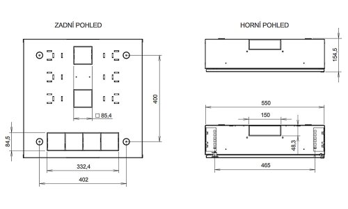 Vstup káblov je možný predpripravenými otvormi v chrbte aj vo všetkých stenách rozvádzača. V zadnej časti rozvádzača sú pripravené otvory na uchytenie na stenu.