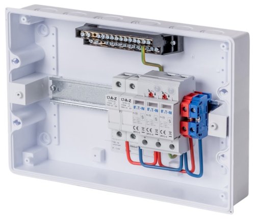 Kompletný certifikovaný rozvádzač chrániaci DC vedenie o max. napätí 1000 V. Určený pre povrchovú montáž. Obsahuje dvojpólový poistkový odpojovač a zvodič prepätia na ochranu jedného reťazca (stringu) fotovoltaického systému.