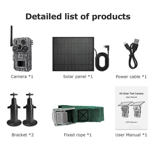 Obsah balenia: 1 ks - Solárny panel s napájacím káblom 1 ks - Pevné lano 1 ks - Užívateľská príručka 1 ks - Kamera 2 ks - Držiak 1 ks - Dobíjací kábel 1 ks - Balenie skrutiek