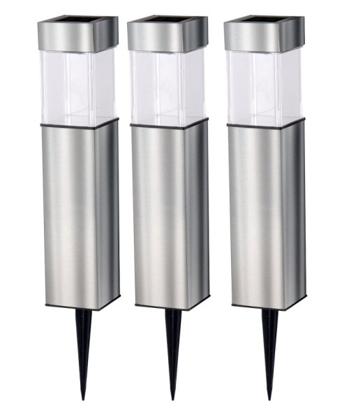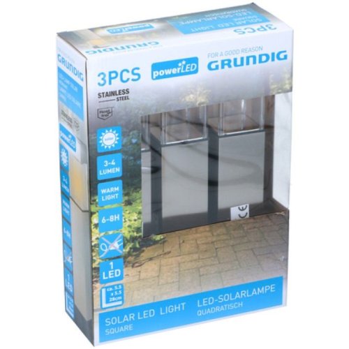 Svietidlo solárne Grundig 0048, sada 3ksSada 3 kusov moderných záhradných svietidiel je vhodná na osvetlenie prístupových ciest, reštauračných záhradiek, ako dekorácia do rodinnej záhrady či terasy. Po zotmení svieti trvalo, dá sa potom jednoducho vypnúť pomocou tlačidla. Montáž je tiež veľmi jednoduchá - pomocou tyčky a bodce sa svietidlo zapichne na zvolené miesto. Odporúčame umiestniť svietidlo na dostatočne slnečné miesto s dobou svitu aspoň 4 hodiny denne. Plocha solárneho panelu by sa mala udržovať v čistote a ničím nezakrývať . 5,5 x 5,5 x 28 cm