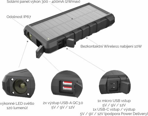 *3 výstupné porty s podporou rýchlonabíjania technológiou Qualcomm® QC 3.0 Technology a Power Delivery *Bezdrôtové Wireless nabíjanie až do výkonu 10W! *IP67! Úplne vodotesné a odolné telo powerbanky proti prachu a ostatným nečistotám (platí iba v prípade, že sú všetky vstupné aj výstupné konektory zakryté napr. silikónovým ochranným krytom). *1W silná LED dióda so 120LM pre dosvit až 30 metrov. *3 režimy LED svetla (stále svetlo, tlmené svetlo, stroboskop) *Podpora obojsmerného konektora USB-C (vstup aj výstup) *Zabudovaná karabína v tele powerbanky pre ľahké uchytenie *Externá karabína v balení *Pogumované telo powerbanky pre bezpečné držanie za zhoršených podmienok a veľmi kvalitné tesniace kryty *Výkonný solárny panel 300mA (špičkový výkon až 400mA) *LED indikácia stavu nabíjania a solárneho nabíjania
