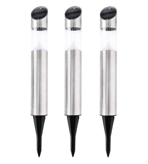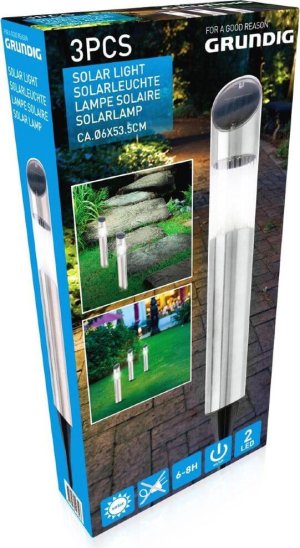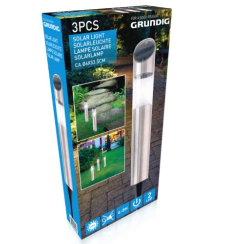 S týmito robustnými solárnymi svietidlami vyrobenými z nerezovej ocele od Grundig môžete úžasne predviesť svoju záhradu. Každé solárne svietidlo O6xH36cm je ukotvené v zemi pomocou priloženého zemného bodca. Telo svietidla je vyrobené z nerezovej ocele. Dekoratívna vložka lampy z plastu s dvoma studenými bielymi LED diódami dokonale završuje celkový dizajn. Vďaka použitej LED a solárnej technológii je toto osvetlenie obzvlášť dlhotrvajúce a energeticky úsporné. Svetlo sa počas dňa nabíja solárnym panelom a automaticky sa zapína pri zotmení pomocou integrovaného svetelného senzora. z nerezovej ocele, strieborná- Ozdobná vložka lampy z plastu- Solárne napájanie- Integrovaná batéria (1,2 V typ AAA, Ni-MH 600mAh)- Svetelný senzor- Zap. /vypínač (vo Svetle)- Vysoká účinnosť s nízkou spotrebou energie- každá 2x LED studená biela (nie je možné vymeniť)- Celková veľkosť so zemným hrotom: O6xH53, 5cmkaždá - Veľkosť každej solárnej lampy: O6xH36cm každá- Celková hmotnosť: cca 0,8kg- Rozsah dodávky: 3x solárna lampa vrátane hrotu