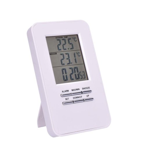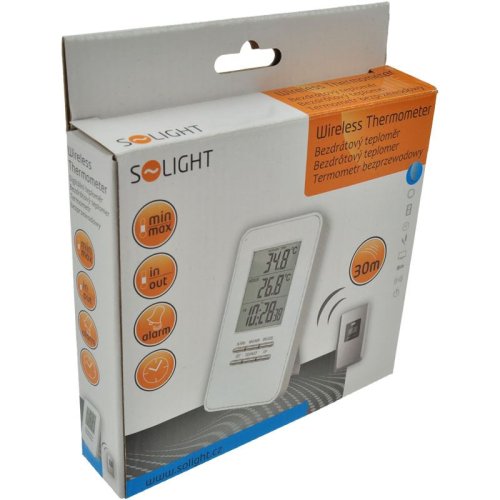 Meranie vnútornej teploty -9 °C až +50 °C. Meranie vonkajšej teploty -50 °C až +70 °C. Pamäť minimálnych a maximálnych teplôt. 1 bezdrôtový senzor (súčasťou balenia). Zobrazuje čas a má funkciu budík. Hlavná jednotka 2 x AAA (LR03) batérie (nie je súčasťou balenia). Senzor 2 x AAA (LR03) batérie (nie je súčasťou balenia). EAN 8592718012229