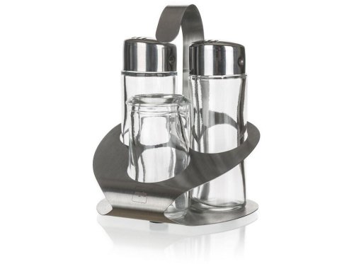 2 dielna dochucovacia sada (soľnička, korenička) s objemom nádobiek 2 × 35 ml v nerezovom stojane.