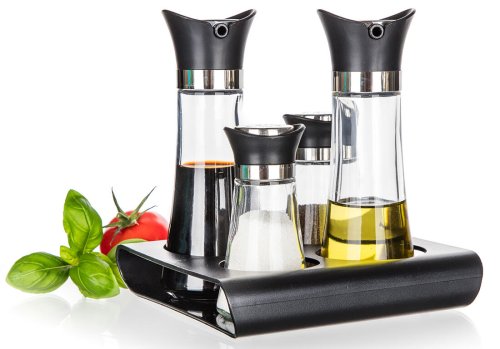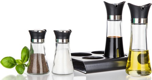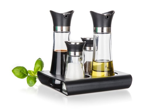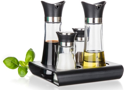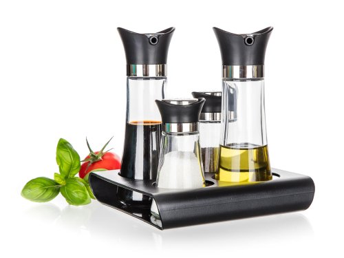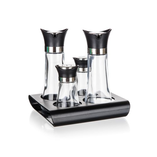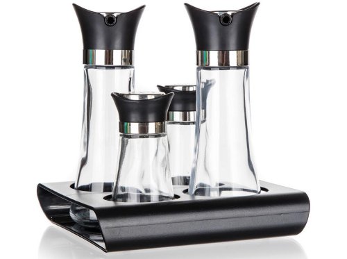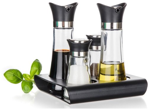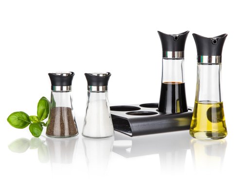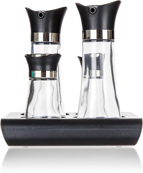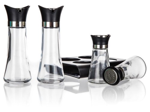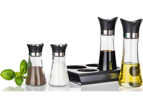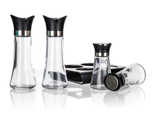 Soľnička a korenička + nádobka na olej a ocot, skl. / PH, so stojanom, EXCELLENT (5 ks).