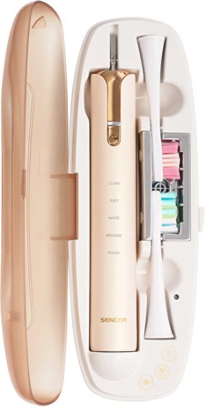 Sonická zubná kefka Sencor SOC 4111GD ponúka profesionálnu starostlivosť o ústnu dutinu v elegantnom prevedení. Disponuje 5 prednastavenými režimami na čistenie a regeneráciu, pričom dosahuje až 40 000 kmitov za minútu. Vďaka tejto technológii dokáže odstrániť povlak niekoľkonásobne účinnejšie ako bežné manuálne čistenie. Špeciálne kmitanie je navrhnuté tak, aby sa zároveň staralo o zdravie vašich ďasien. Šikovný časovač s technológiou Quadpacer rozdeľuje čistenie do štyroch rovnomerných blokov pre maximálnu efektivitu. LED indikátor vás informuje o stave batérie a ergonomická rukoväť zaisťuje pohodlnú manipuláciu. Kefka má veľmi nízku spotrebu energie a je vodeodolná podľa štandardu IPX7, čo znamená, že ju možno bezpečne používať aj v sprche. Výdrž batérie dosahuje až 45 dní pri bežnom každodennom použití. Výmenné kefkové hlavice zaisťujú dlhodobú hygienu a celosvetová kompatibilita napájania 100-240 V umožňuje bezproblémové použitie kdekoľvek na svete. Balenie obsahuje telo kefky, dve hlavice, indukčnú nabíjačku, pohárik a prenosné puzdro s USB konektorom a UV sterilizátorom. Puzdro pojme jedno telo kefky a buď dve hlavice, alebo jednu hlavicu a jednu zubnú pastu.