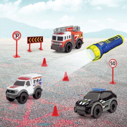 Set 3 ks mini dopravných záchranárskych prostriedkov na voľnobeh - hasičské auto, polícia a ambulancia. Súčasťou sú dopravné značky a baterka, ktorá má 3 svetelné funkcie. Veľkosť 10 cm.