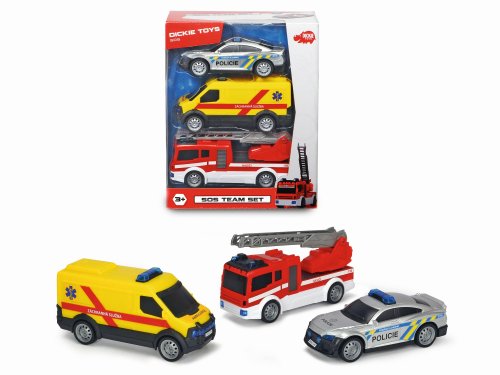 Set 3 ks dopravných prostriedkov na voľnobeh. Hasičské auto má výsuvný rebrík. Rozmery autíčok (dĺžka x výška x hĺbka): policajné auto 14 x 5 x 5,5 cm, ambulancia 15 x 7 x 5,5 cm, hasičské auto 16 x 7,2 x 5,5 cm.