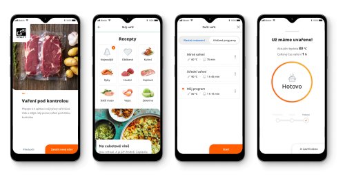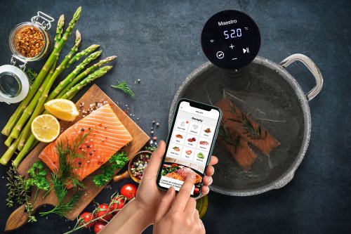 Príklad: Vložíte do hrnca s vodou zavákuované suroviny a odídete do práce alebo na výlet. Cestou si na mobile zvolíte recept a pošlite cez apku pokyn do sous-vide G21 Maestro. Po návrate môžete prestierať.