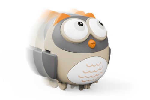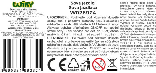 Sova jazdiaca. Veľkosť 7 cm. ON/OFF prepínač na spodnej strane. Po aktivácii sa sova pohybuje smerom dopredu. 2 AAA batérie, nie sú súčasťou. Krídla je možné manuálne vyklopiť.