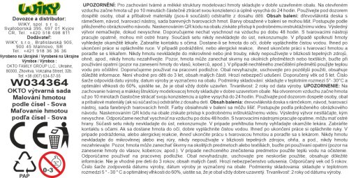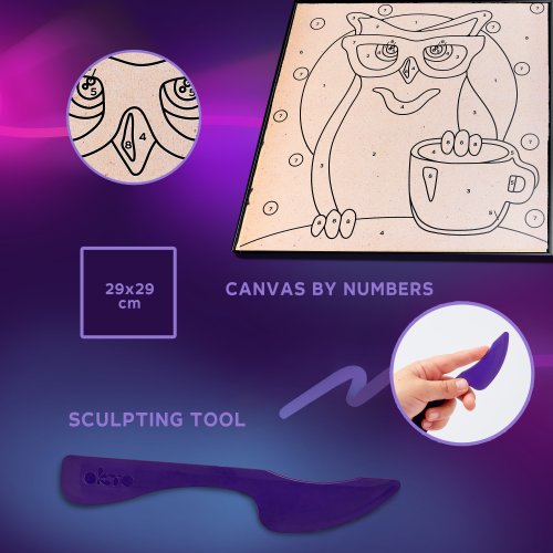 Sova výtvarná sada maľovania hmotou podľa čísel. Samotvrdnúca hmota (air clay), maľovanie prstami. Veľkosť plátna 29x29 cm. Obsah balenia - plátno, obrázkový návod, tvarovacie nástroje, samotvrdnúca hmota.