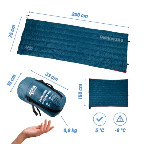 Acra Dekker380 je ideálnou voľbou pre tých, ktorí chcú spojiť praktickosť s komfortom. V režime spacáku vás obklopí hrejivé perie, zatiaľ čo po rozopnutí získate veľkorysú deku, pod ktorou sa zmestia aj dve osoby. Skvelý spoločník na kempovanie, do karavanu, obytného vozidla aj pod širák.