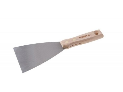 Maliarska stierka (špachtľa) s brúseným oceľovým britom as drevenou nitovanou rukoväťou. Maliarske stierky sa používajú na zapravovanie dier, zoškrabanie prebytočného materiálu a pod. Šírka britu 100 mm. EAN 8590804049852