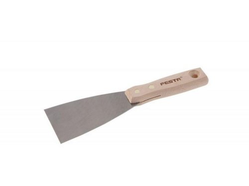 Maliarska stierka (špachtľa) s brúseným oceľovým britom as drevenou nitovanou rukoväťou. Maliarske stierky sa používajú na zapravovanie dier, zoškrabanie prebytočného materiálu a pod. Šírka britu 80 mm. EAN 8590804049845