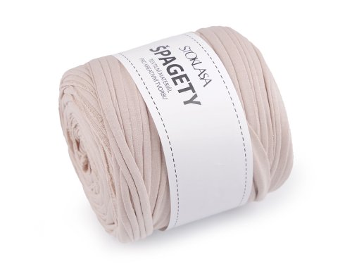 Špagetovú priadzu tvoria narezané prúžky látky z recyklovanej bavlny. Priadza je mierne elastická. Využijete ju na pletenie a háčkovanie koberčekov, diek, tašiek, šál, košíkov, batohov, obliečky na vankúše a pod. Je príjemná na dotyk, vhodná aj na pletenie rukami. >Veľkosť ihlíc: 9 Veľkosť háčika: 8 Varianty sú v základných farbách v rôznych odtieňoch (tmavšie, svetlejšie, melírované).